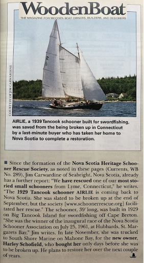 An update about schooner AIRLIE was published in Wooden Boat Magazine.